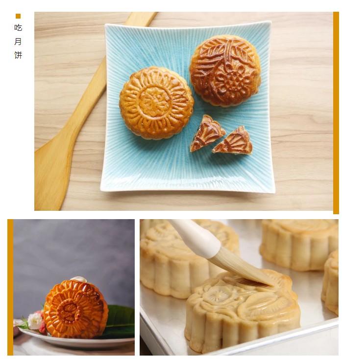 吃月饼 月饼,又叫月团、丰收饼、宫饼、团圆饼等,是古代中秋祭拜月神的供品。 月饼象征着大团圆,人们把它当作节日食品,用它祭月、赠送亲友。发展至今,吃月饼已经是中国南北各地过中秋节的必备习俗,中秋节这天人们都要吃月饼以示“团圆”。