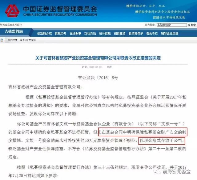 证监局在检查中发现的问题是:“文旅一号”这只产品的基金合同中明确约定不进行托管,但没有在合同中明确保障私募基金财产安全的制度措施。而且,产品剩余的尚未对外投资的50万元募集资金管理不规范,以现金形式存放于公司。