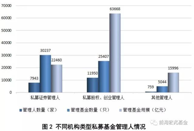 截至2017年8月底,已登记的机构类型为私募证券投资基金的私募基金管理人7943家,管理正在运作的基金30237只,管理基金规模2.25万亿元;私募股权、创业投资基金管理人11950家,管理正在运作的基金25407只,管理基金规模6.37万亿元;其他私募投资基金管理人759家,管理正在运作的基金5044只,管理基金规模1.60万亿元[3]。