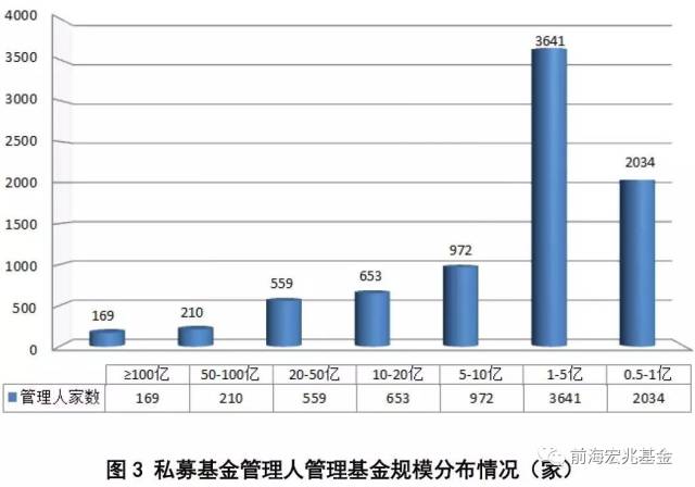 截至2017年8月底,已登记私募基金管理人管理基金规模大于100亿元的169家,管理基金规模50-100亿元的210家,管理基金规模20-50亿元的559家,管理基金规模10-20亿元的653家,管理基金规模5-10亿元的972家,管理基金规模1-5亿元的3641家,0.5-1亿元2034家。截至2017年8月底,已登记的私募基金管理人有管理规模的共17786家,平均管理基金规模5.74亿元。