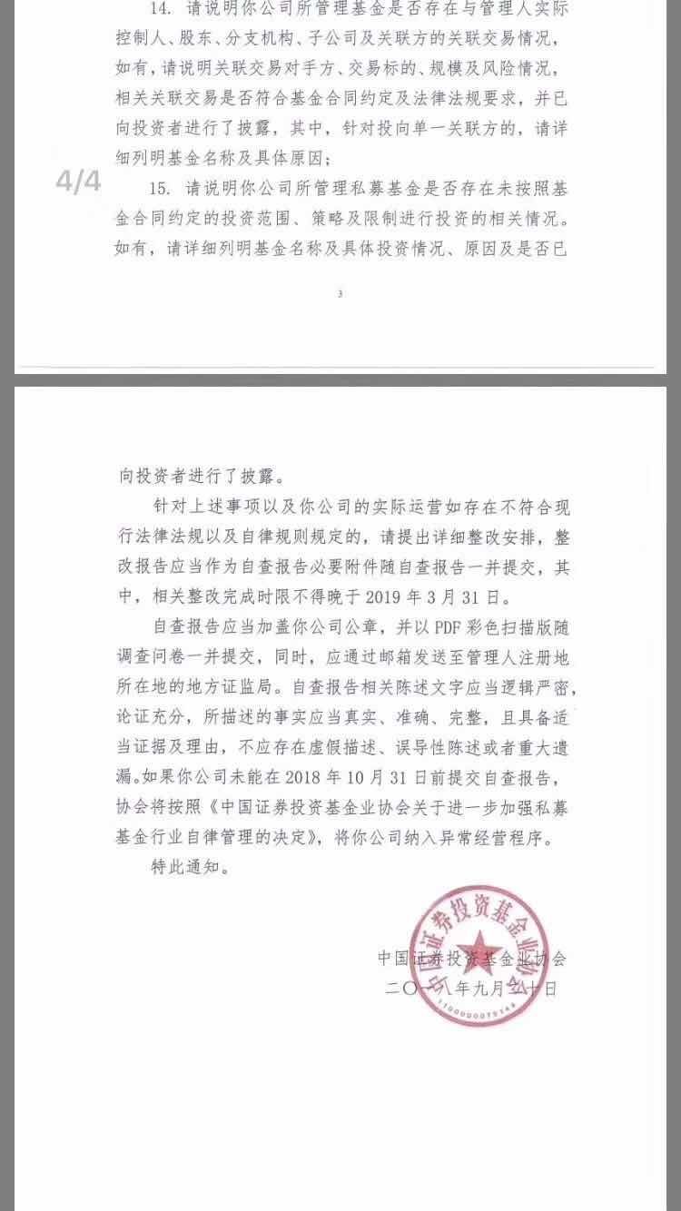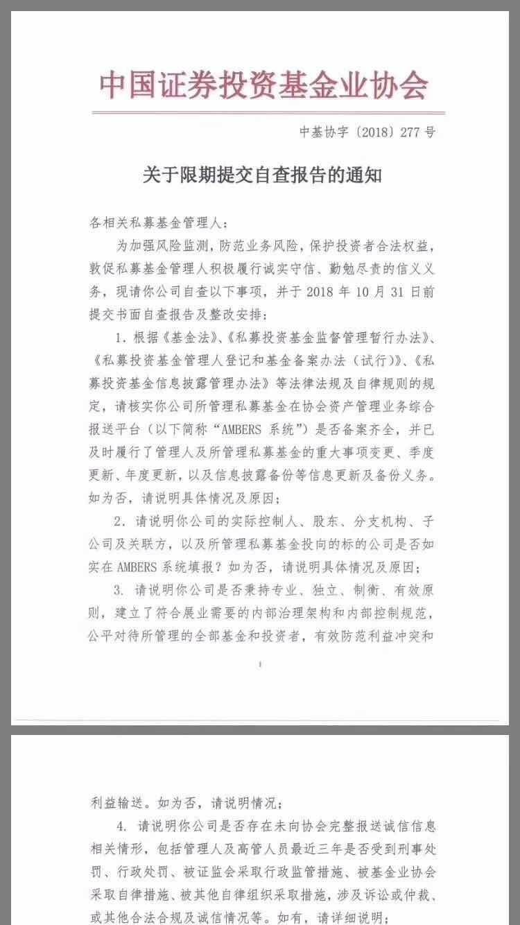 昨日晚间,部分私募基金管理人收到中国基金业协会下发的《关于限期提交自查报告的通知》(中基协字〔2018〕277号),要求管理人开展自查工作,并于2018年10月31日前提交书面自查报告及整改安排。