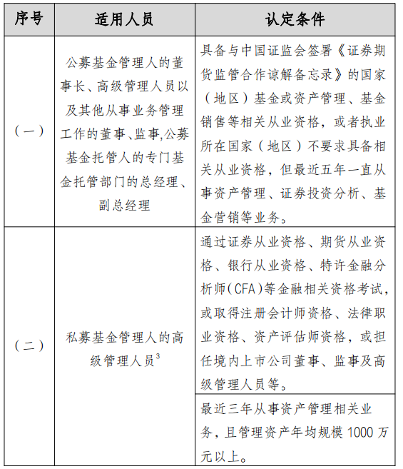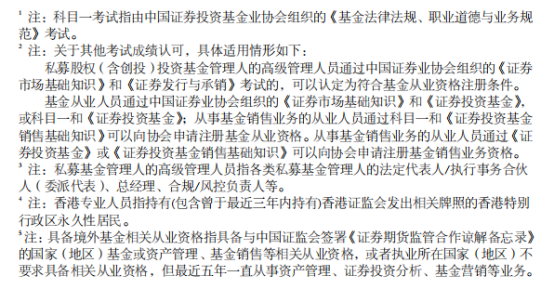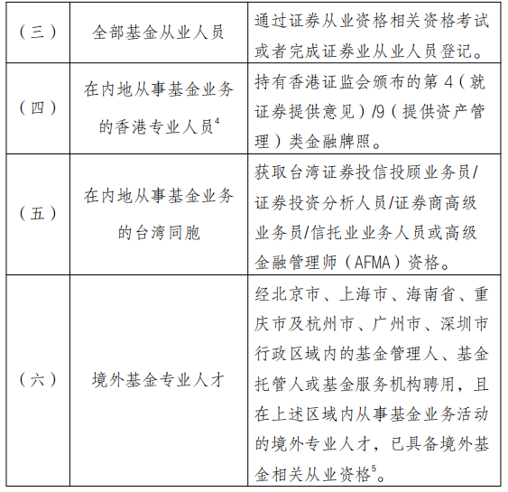 (二)私募股权(含创投)投资基金管理人的法定代表人、执行事务合伙人(委派代表)、合规风控负责人等高级管理人员;(三)基金托管人中从事与基金业务相关的账户管理、资金清算、估值复核、投资监督、信息披露、内部稽核监控等专业人员,包括相关业务部门的管理人员;(四)基金服务机构中从事与基金业务相关的基金销售、销售支付、份额登记、估值、投资顾问、评价、信息技术系 统服务等专业人员,包括相关业务部门的管理人员;(五)中国证券监督管理委员会(以下简称中国证监会)及协会规定需要取得从业资格的其他人员。(五)不存在《证券投资基金法》第十五条规定的情形;(六)最近五年未被中国证监会撤销基金从业资格或者被协会取消基金从业资格;(七)未被金融监管部门或者行业自律组织采取禁入措施,或者执行期已届满;(八)法律法规、中国证监会和协会规定的其他条件。申请人豁免从业资格考试部分科目的,应当符合国家、金融监管部门及行业自律组织有关规定,具备从事基金业务活动所需的专业能力,掌握基金业务活动相关的专业知识。(一)申请人豁免从业资格考试部分科目的,应当符合国家、 金融监管部门及行业自律组织有关规定,具备从事基金业务活动所需的专业能力,掌握基金业务活动相关的专业知识。境外人员申请注册从业资格的,依据国家有关政策及安排等办理。(二)申请人若未通过从业资格考试,但具备其他条件,且通过协会组织的专项培训并认定合格的,自合格之日起两年内,视同临时具备从业资格注册条件。《管理规则》规定的从业资格管理工作包括从业资格注册、从业资格信息变更、后续职业培训管理、诚信信息管理和从业资格注销等内容。机构应当建立健全从业人员资格管理制度,规范岗位职责,加强从业人员职业道德教育,明确行为规范,建立健全从业人员资格管理制度,组织实施从业人员资格管理和后续职业培训,充分履行从业资格管理主体责任。《管理规则》规定从业人员应当恪尽职守,诚实守信,守法合规,忠实于投资者利益,将投资者利益置于个人及机构利益之上,公平对待投资者;应当谨慎勤勉,具备从事基金业务所必需的专业知识和技能;应当严格遵守法律法规、监管规定、自律规则、机构规章制度以及与投资者的约定等。