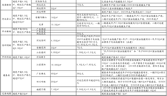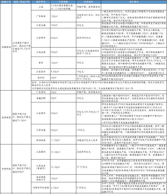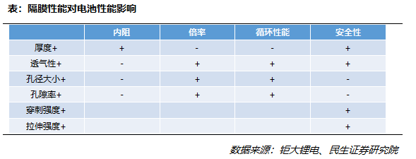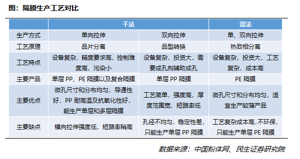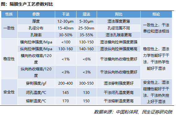 未来湿法隔膜在动力电池中将走高端的市场路线,而中低端动力电池将以干法为主。干法隔膜熔点高于湿法,具有较优的耐压性能,主要用于储能、磷酸铁锂动力电池、两轮车等领域,且成本相对低于湿法。湿法隔膜拉伸强度优于干法,产品厚度偏薄,适用于对能量密度要求高的三元动力电池。而对于湿法隔膜工艺,对动力电池性能要求的提高将逐渐使湿法涂覆隔膜成为主流。湿法隔膜具有以下三点优势:1)更高的孔隙率与透气性(降低电池内阻);2)更薄更均匀的薄膜厚度(延长电池寿命);3)更强的穿刺强度与拉伸强度(提升电池安全性)。湿法隔膜在厚度均匀性、力学性能、透气性能、理化性能等方面较为优良,有利于电解液的的吸液保液并改善电池的充放电及循环能力,适合做高容量电池,但湿法隔膜存在因受限于基体材料导致热稳定性较差的缺点。通过在湿法隔膜基膜上涂布陶瓷氧化铝、PVDF等胶粘剂,能够大幅提高基膜的热稳定性,弥补湿法隔膜的热稳定性短板,提升产品性能。