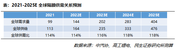 隔膜行业短期内供需平衡紧张。根据民生证券测算,21 年全球供需比 114%,预计 22年供需比保持 114%,受上游隔膜生产设备产能限制,供需紧平衡态势延续。24-25 年主要企业产能扩张周期结束,全球供需比提升至 118%,供需关系缓和。