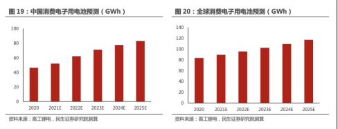 | 消费电子迭代更替频率高,未来市场景气。消费电子板块主要包括了智能手机, 平板,个人电脑(PC)与最近逐渐热门的穿戴式设备。受 5G 通讯、云计算以及物 联网等高新技术发展与居民结构收入增加等因素影响,消费电子的换机频率将近一步加快,另一方面,可穿戴设备市场逐渐成熟,下游需求持续增强。消费电子电池“量质”持续提升,据高工锂电预测,2025 年国内消费用电池 83GWh,全球消费用电池 116.9GWh,年复合增长率分别为 12.38%和 7%。 |