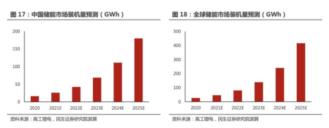 | 储能是电池需求的第二大市场,根据《中国锂离子电池行业发展白皮书(2022年)》,2021年储能电池出货量66.3GWh,同比增长132.6%。全球储能锂离子电池出货量快速增长的驱动因素来自中国企业,2021年中国企业储能锂离子电池出货量为42.3GWh,占全球出货量的63.8%。根据高工锂电预测,储能市场未来规模将大超预期,2025年中国储能装机量180GWh,全球储能装机量416GWh,年复合增长率稳定,分别为62%和73%。 |