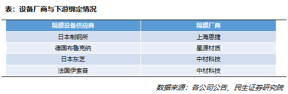 锂离子电池隔膜制造处于锂离子电池产业链的中游,上游为聚丙烯、聚乙烯及添加剂等基体材料以及生产设备,下游为锂离子电池产品及其终端应用领域。上游产业主要影响锂离子电池隔膜行业产品质量、成本及产品利润空间,下游产业则影响锂离子电池隔膜行业的发展前景。隔膜上游生产原材料包括聚乙烯、聚丙烯、石蜡油、二氯甲烷等,其中以聚乙烯(PE)为主,占原材料比重相对较大,价格多受国际原油价格变动影响。产业链上游的核心是生产设备,目前已形成绑定格局。隔膜设备工艺复杂,制造精密,目前全球仅有四家供货商,分别为日本制钢所、德国布鲁克纳、日本东芝以及法国伊索普。日本制钢所绑定国内隔膜龙头企业恩捷股份,恩捷股份已锁定制钢所未来三年的中国区订单,合同排他性较强。德国布鲁克纳的隔膜生产链由星源材质孵化培养,与星源材质存在深入的战略合作关系,因此订单同样被锁定。日本东芝与法国ESSOP主要供货对象是中材科技。