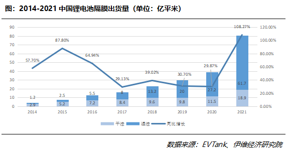 近年来,受益于下游新能源汽车的持续高景气度和储能行业的爆发性增长,带动了上游锂电隔膜需求。根据EVTank数据,2021年,全球锂离子电池总体出货量562.4GWh,同比大幅增长91.0%;中国锂离子电池隔膜出货量为80.6亿平米,同比大幅增长108.3%,其中湿法隔膜出货量61.7亿平米,干法隔膜出货量18.9亿平米。从产量来看,根据川财证券研究报告,2021年国内隔膜产量79亿平方米,同比增长112.5%,其中 湿法隔膜产量60.6亿平方米,占比76.7%,同比增长132%。从价格走势来看,2021年干法、湿法隔膜价格有所回升,干法隔膜上升幅度5-10%,湿法隔膜上升幅度10-15%,湿法隔膜企业规模大,行业话语权强、议价能力较强。