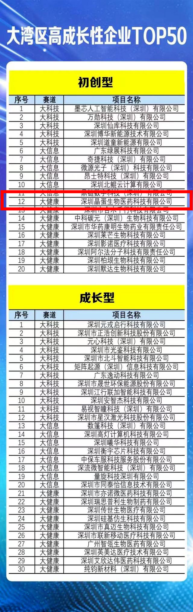 宏兆基金已投企业-晶蛋生物 ✦ 7月21日上午,石岩湖国际LP高峰论坛在深圳国际会展中心隆重举行,现场发布了《大湾区高成长性企业TOP50》榜单,晶蛋生物位列初创型大健康榜单第一位。据了解,本次上榜企业中,估值最高的元戎启行身价高达100亿人民币。 ✦ ✦ 《大湾区高成长性企业TOP50》榜单由深圳市创业投资同业公会评选发布,重点聚焦大健康、大信息、大科技三大赛道,旨在发掘在新经济领域具有发展潜力的高成长性企业,促进创新要素的融合,推动产业纵深发展,并展现大湾区在新兴产业方面的成果和优秀企业风采。评选过程中,评委会重点考察企业的创新技术和资本市场价值,二者占据了评选系数权重的6成,表明该榜单更加关注企业的创新能力、研发投入、技术壁垒、专利技术认证、成长速度、总融资额、融资轮次、最新一轮估值、投资方背景等内容,体现出“高精尖”的评选倾向。 经过投资机构推荐、各赛道投资人集中打分评议,历经五个月,最终确定50家高成长性企业名单。上榜名单中,初创型企业20家,成长型企业30家;各赛道中,大健康19家,大科技17家,大信息14家。晶蛋生物此次入选该榜单,说明其技术创新能力与发展潜力受到了相关政府部门、各界的一致认可! 信息来源:晶蛋生物 免责声明:本文所涉及内容仅作分享交流,不作为投资建议。 引用文章版权归原作者所有,如有侵权,请联系我们进行删除。