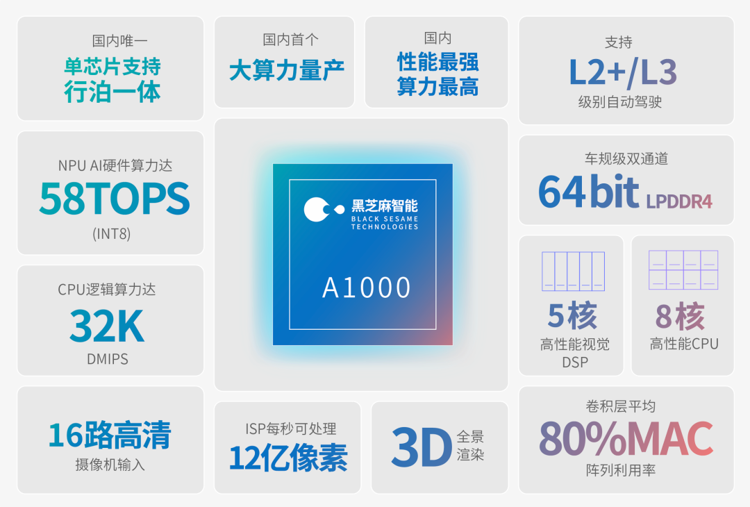 智能驾驶将在未来3-5年迎来高速发展期,在智能驾驶时代,车内的数字化应用和数字化体验需求爆发,算力是主要的角逐点之一,大算力自动驾驶芯片成为刚需。另一方面,智能化、电动化趋势促使全球汽车产业格局重构,中国自主品牌车企跻身领先位置,而包括芯片在内的本土生态体系是中国车企打造竞争力的有力保障。专注于大算力自动驾驶计算芯片与平台技术的黑芝麻智能,拥有汽车与芯片行业的复合型团队、开放的生态和业务模式,以及自研核心技术等优势。黑芝麻智能已经建立起完善的客户赋能体系,包含:自研车规级图像处理ISP和车规级深度神经网络加速器NPU、华山系列自动驾驶计算芯片、山海人工智能开发平台、瀚海自动驾驶中间件、算法和Data Best数据闭环解决方案,全栈式自动驾驶解决方案,全维度赋能车厂安全、快速地实现产品落地。黑芝麻智能发布的华山二号A1000系列芯片是首个量产的符合车规、算力最大、性能最强、单芯片支持行泊一体域控制器的国产芯片平台。值得一提的是,黑芝麻智能也是国内首家集齐功能安全专家认证、功能安全流程认证、功能安全产品认证和车规软件认证的自动驾驶芯片公司。