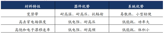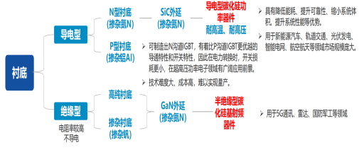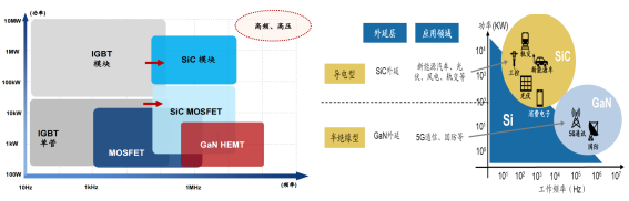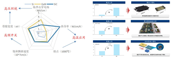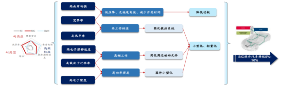 SiC碳化硅器件是指以碳化硅为原材料制成的器件,按照电阻性能的不同分为导电型碳化硅功率器件和半绝缘型碳化硅基射频器件。功率器件又被称为电力电子器件,是构成电力电子变换装置的核心器件。电力电子器件是对电能进行变换和控制,所变换的“电力”功率可大到数百MW甚至GW,也可以小到数W甚至1W以下。电力电子装置正是实现电能高质量高效转换、多能源协调优化、弱电与强电之间控制运行、交流与直流之间能量互换、自动化高效控制等的重要手段。与硅基器件类似,当前碳化硅材料功率器件主要分为二极管、晶体管和功率模块,其中,二极管主要包括肖特基二极管(SBD)、结势垒肖特基二极管(JBS)、PiN功率二极管(PiN);晶体管主要包括金属氧化物半导体场效应晶体管(MOSFET)、绝缘栅双极晶体管(IGBT)、结型场效应晶体管(JFET)、双极型晶体管(BJT)、晶闸管。其中二极管及晶体管类的MOSFET器件应用较为广泛。资料来源:亿渡数据《2022年中国SiC碳化硅器件行业深度研究报告》;陈尧《国内外碳化硅功率器件发展综述》,蔡蔚《第三代宽禁带功率半导体及应用发展现状》,财通证券导电型碳化硅功率器件主要是通过在导电型衬底上生长碳化硅外延层,得到碳化硅外延片后进一步加工制成,品种包括造肖特基二极管、MOSFET、IGBT等,主要用于电动汽车、光伏发电、轨道交通、数据中心、充电等基础建设。半绝缘型碳化硅基射频器件是通过在半绝缘型碳化硅衬底上生长氮化镓外延层,制得碳化硅基氮化镓外延片后进一步制成,包括HEMT等氮化镓射频器件,主要用于5G通信、车载通信、国防应用、数据传输、航空航天。碳化硅、氮化镓材料的饱和电子漂移速率分别是硅的2.0、2.5倍,因此碳化硅、氮化镓器件的工作频率大于传统的硅器件。然而,氮化镓材料存在耐热性能较差的缺点,而碳化硅的耐热性和导热性都较好,可以弥补氮化镓器件耐热性较差的缺点,因此业界采取半绝缘型碳化硅做衬底,在衬底上生长氮化镓外延层后制造射频器件。图2.主要功率分立器件所处的功率、频率区间及应用领域资料来源:Rohm;华泰证券;天科合达招股书;广发证券碳化硅功率器件性能优势如下:1)更强的高压特性。碳化硅的击穿电场强度是硅的10余倍,使得碳化硅器件耐高压特性显著高于同等硅器件。2)更好的高温特性。碳化硅相较硅拥有更高的热导率,使得器件散热更容易,极限工作温度更高。耐高温特性可以带来功率密度的显著提升,同时降低对散热系统的要求,使终端可以更加轻量和小型化。3)更低的能量损耗。碳化硅具有2倍于硅的饱和电子漂移速率,使得碳化硅器件具有极低的导通电阻,导通损耗低;碳化硅具有3倍于硅的禁带宽度,使得碳化硅器件泄漏电流比硅器件大幅减少,从而降低功率损耗;碳化硅器件在关断过程中不存在电流拖尾现象,开关损耗低,大幅提高实际应用的开关频率。资料来源:Researchgate;Wolfspeed;Rohm;英飞凌;广发证券;华泰证券碳化硅较硅拥有更高热导率,散热容易且极限工作温度更高,可有效降低汽车系统中散热器的体积和成本。同时,SiC 材料较高的载流子迁移率使其能够提供更高电流密度,在相同功率等级中,碳化硅功率模块的体积显著小于硅基模块,进一步助力新能源汽车实现轻量化。SiC MOSFET 器件较硅基IGBT在开关损耗、导电损耗等方面具备显著优势,其在新能源汽车的应用可有效降低损耗。根据丰田官网,丰田预测 SiC MOSFET 的应用有助于提升电动车的续航里程约5%-10%。由于SiC材料具备更高的功率密度,所以同等功率下,SiC 器件的体积可以缩小至1/2甚至更低。由于SiC MOSFET的高频特性,SiC的应用能够显著减少电容、电感等被动元件的应用,简化周边电路设计。资料来源:Rohm,英飞凌,Wolfspeed,丰田,华泰证券