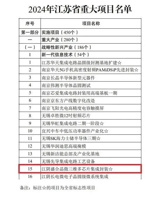 ✦ 近日,江苏省发展与改革委员会发布2024年江苏省重大项目名单,盛合晶微半导体公司三维多芯片集成封装项目连续2年入选,并被列为全省标志性项目。 ✦ ✦ 公司三维多芯片集成封装项目计划总投资12亿美元,项目的实施将持续扩充规模化的高密度中段Bumping量产产线及12英寸先进节点大尺寸WLCSP晶圆级尺寸封装产线,进一步发展三维多芯片集成技术,形成月产8万片集成电路中段凸块制造及1.6万片集成芯片加工的生产能力,建设chiplet多芯片集成工艺平台一站式服务基地。 当前人工智能和数字经济快速发展,对芯片算力需求日益高涨。盛合晶微三维多芯片集成封装项目抓住机遇、加快发展,已超额完成了年度投资目标,实际设备采购数量过半,部分设备完成安装调试并形成产能,项目开始贡献营收。