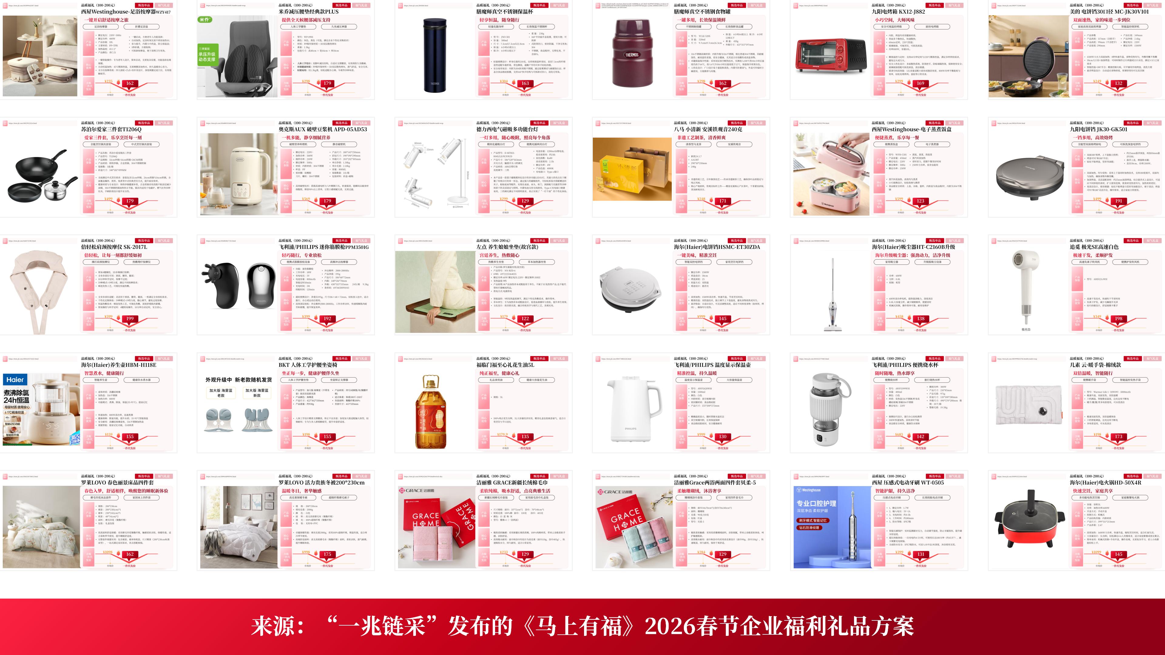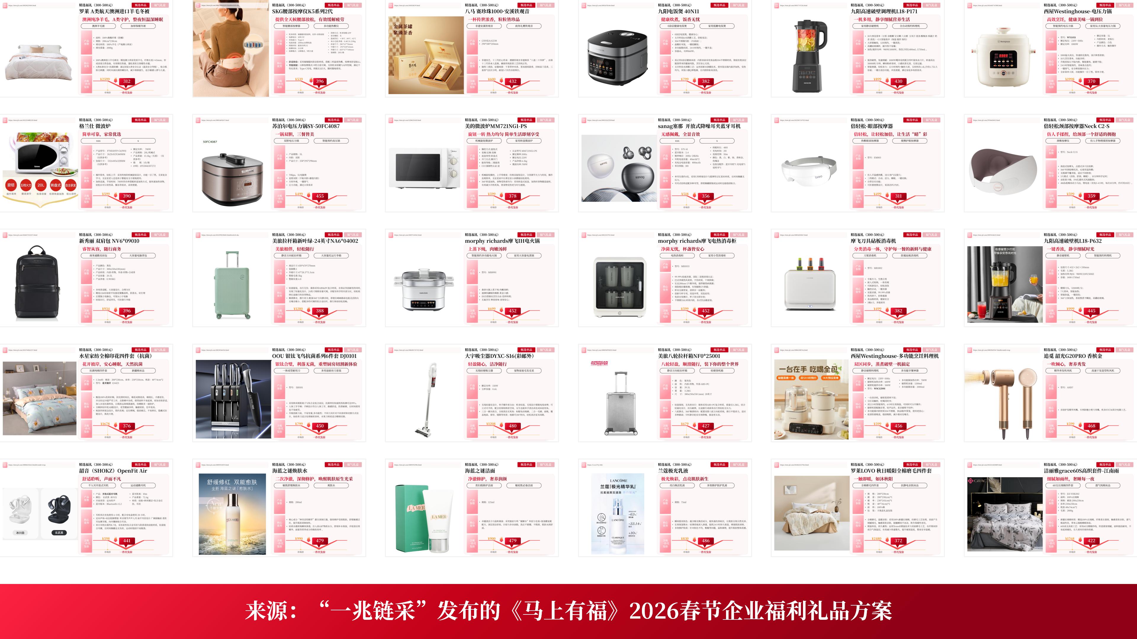 福利礼品的品质直接关系到企业的诚意体现与员工的接收体验。因此,一兆链采构建了覆盖9大品类、超100家一线品牌及超500款产品的春节礼品资源库,确保每一件礼品均具备卓越品质与品牌保障。