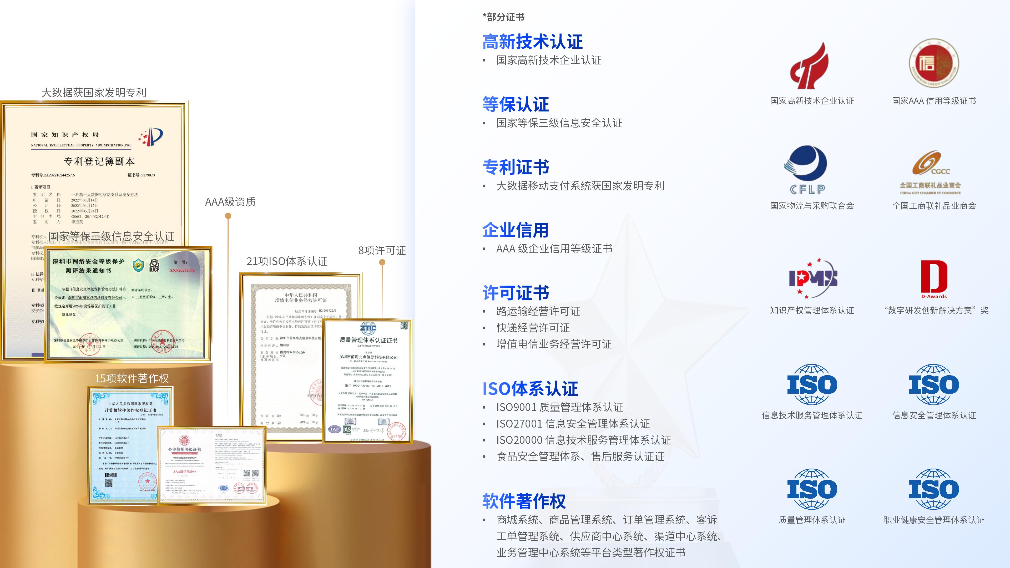 国家高新技术企业:获国家等保三级信息安全认证、大数据获国家发明专利,保障合规性与安全性。
