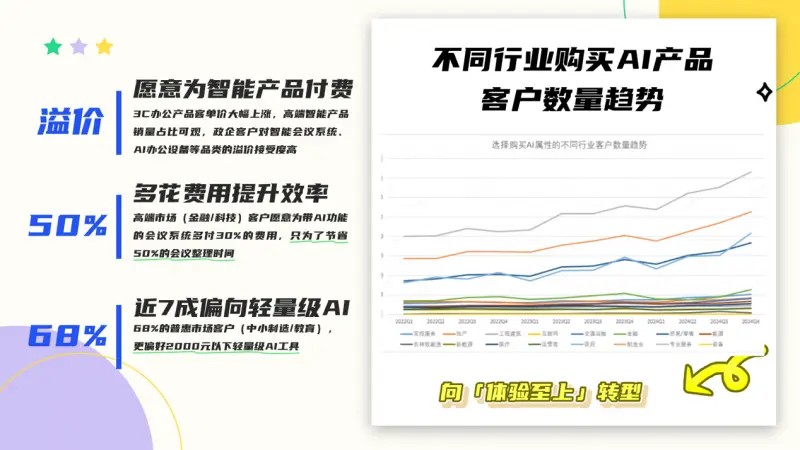 高端市场(金融/科技):78%的企业愿为AI功能支付20%以上溢价,侧重决策支持与客户分析工具;