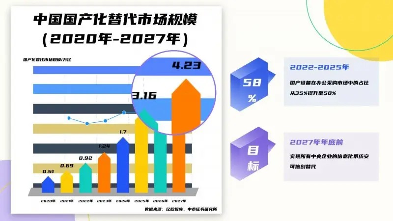 2022-2025年,国产设备在办公采购中的占比从35%提升至58%,2027年市场规模预计达4.23万亿元(复合增长率35.29%)。