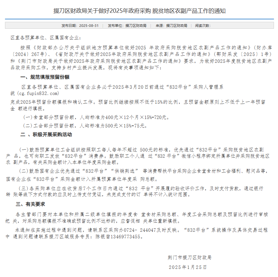 “832平台”(脱贫地区农副产品网络销售平台) 是财政部、农业农村部、国家乡村振兴局等部门共同推动设立的政府采购脱贫地区农副产品平台,也是各地财政部门推荐的首选采购渠道。