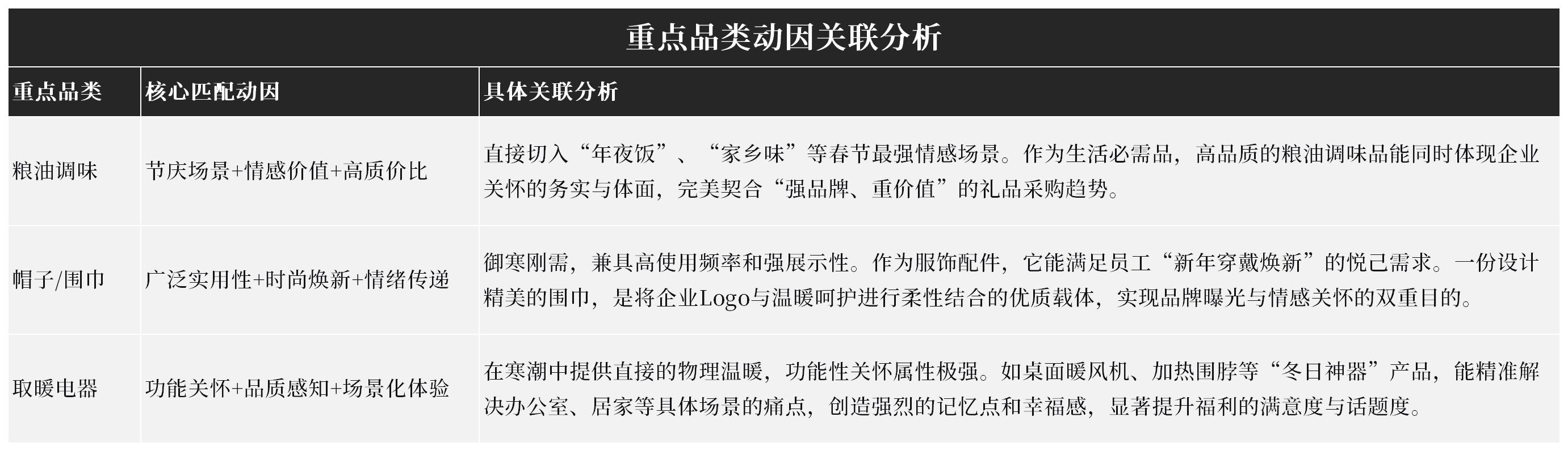 农历春节前置带来的心理与行为需求:2026年农历春节(2月16日)相对较早,使得10月-1月成为春节备货、员工年礼、商务馈赠需求集中释放的关键准备期。企业采购需同时满足“年终关怀”与“新年祝福”的双重情感表达。