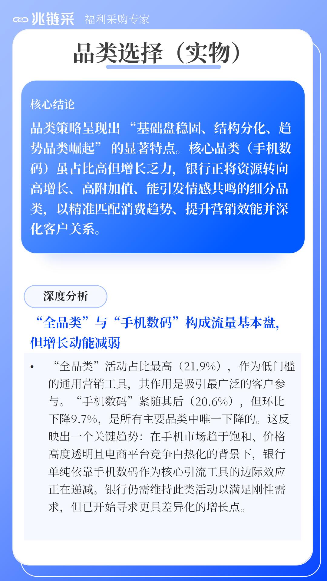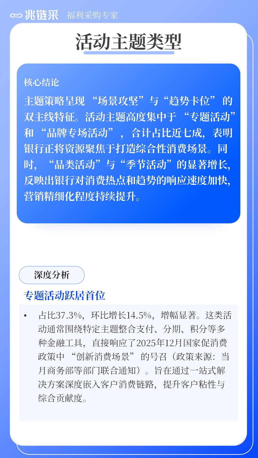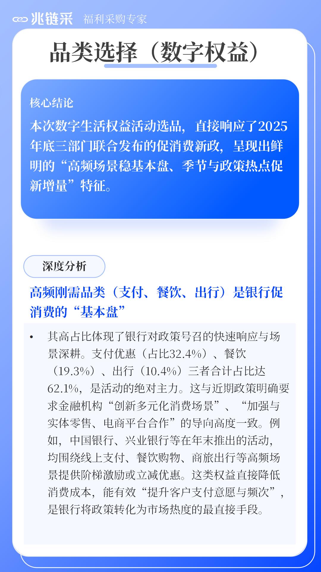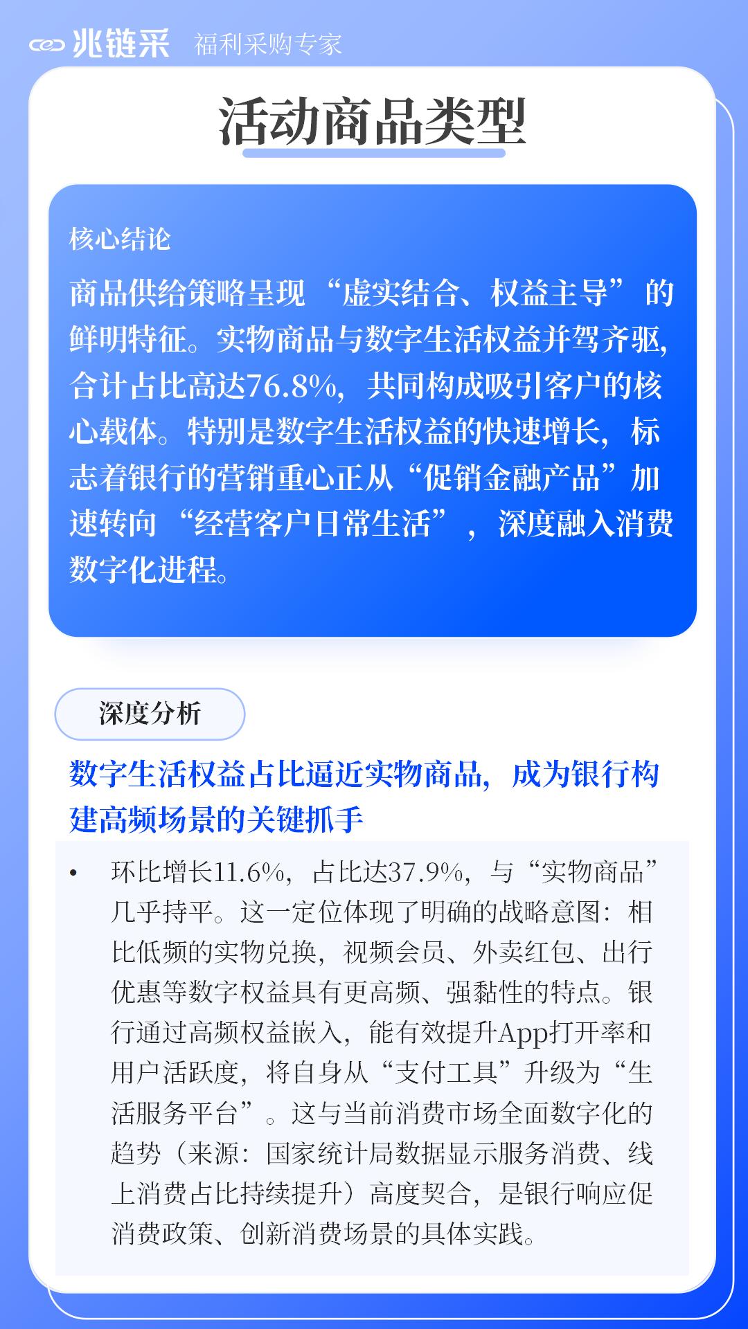 场景攻坚,权益崛起:“专题活动”占比最高(37.3%),数字生活权益占比(37.9%)已逼近实物商品,银行正加速融入客户高频生活场景。