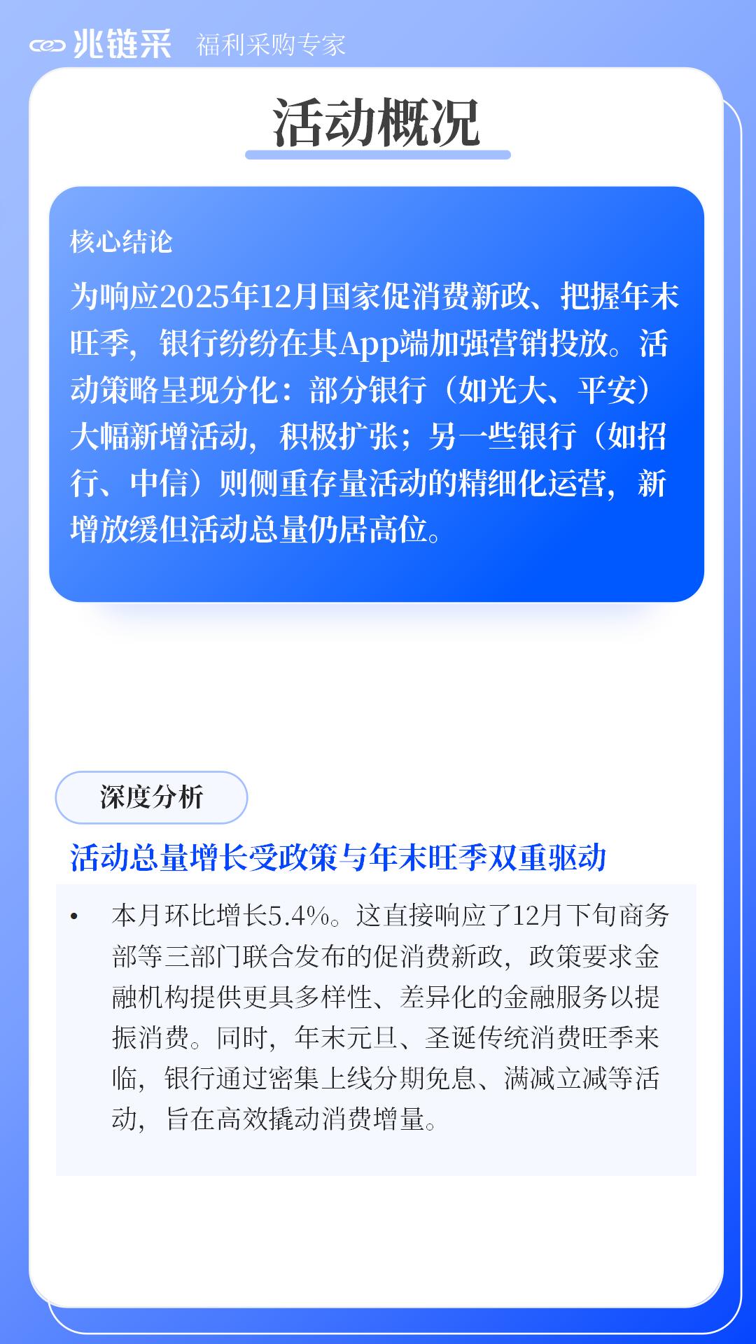 总量增,新增减:活动总量环比增5.4%,响应年末促消费新政;但新增活动环比降18.6%,标志策略正向向“留客”深耕。