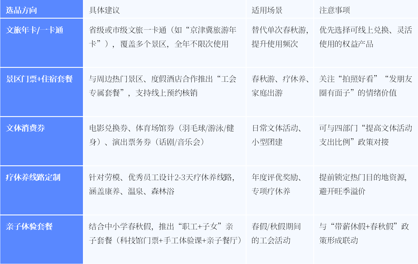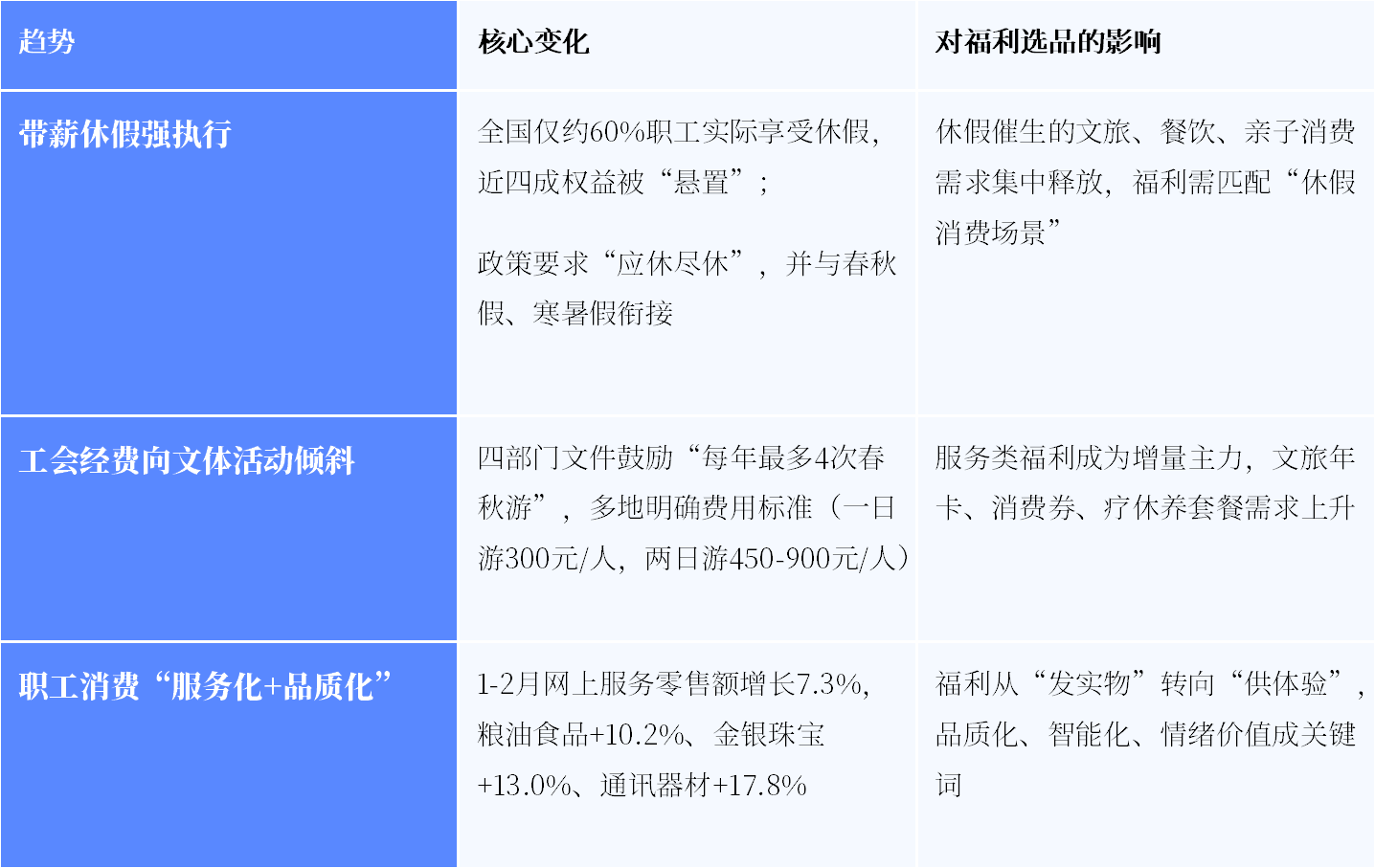 2026年一季度,带薪休假制度从“政策倡导”迈入“强执行”阶段。贵州、浙江、安徽等多省密集发文,要求“原则上实现全员休满休足”。与此同时,四部门联合发文鼓励基层工会每年最多开展4次春秋游,多地工会消费券发放标准相继落地。福利选品的底层逻辑正在改变:职工有了更多“可支配的休假时间”,工会经费向文体和服务类支出倾斜,消费结构加速从“买什么”转向“体验什么”。