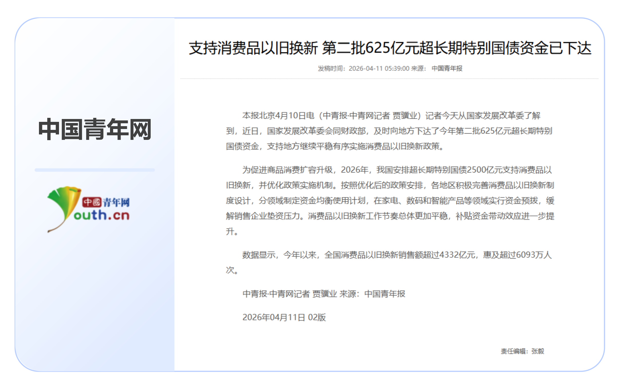 先看一组最新数据:2026年4月10日,国家发展改革委会同财政部,向地方下达了今年第二批625亿元超长期特别国债资金,支持各地继续实施消费品以旧换新政策。