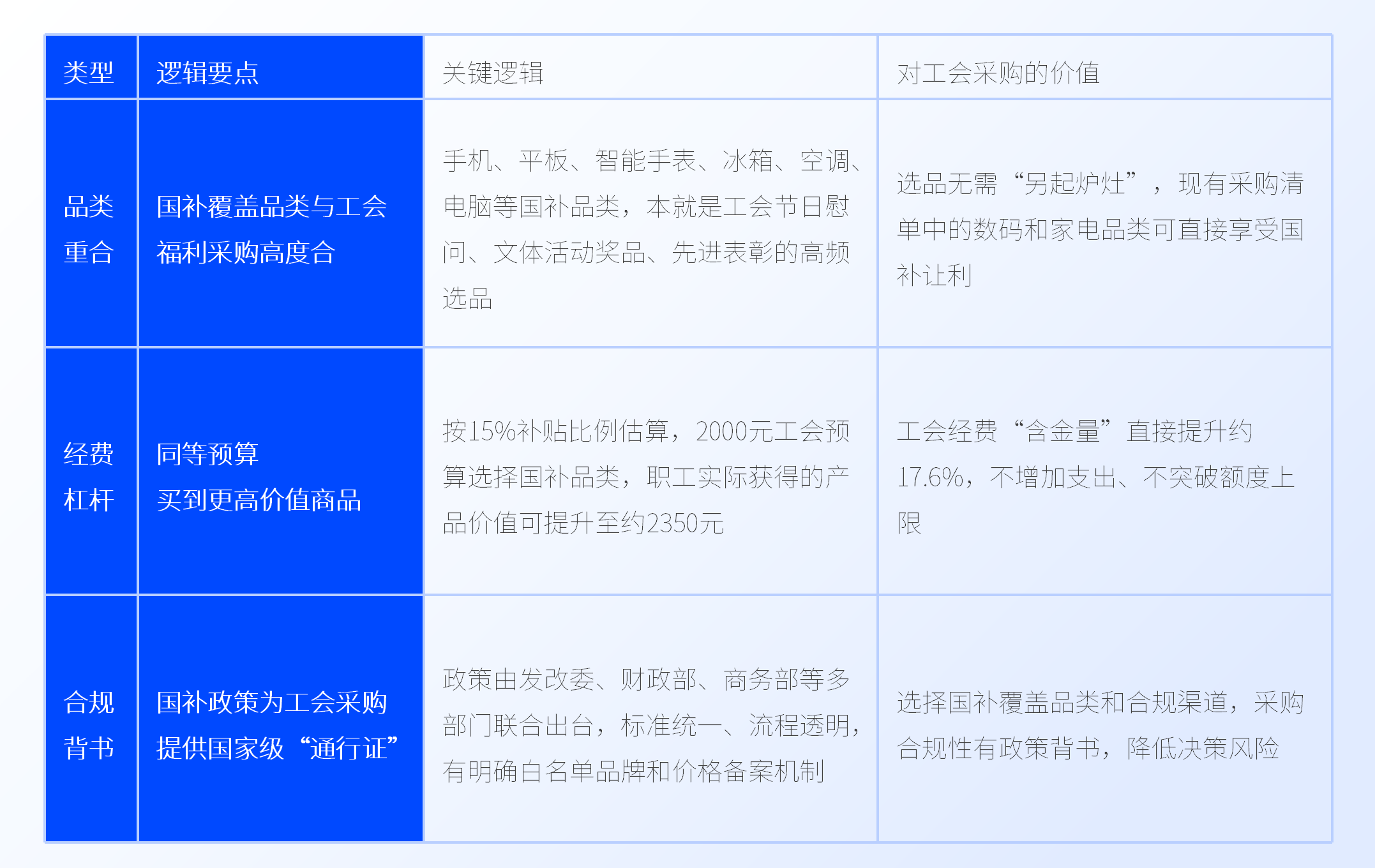 品类高度重合:国补覆盖的六大类家电和四大类数码智能产品,本就是工会采购的核心品类。